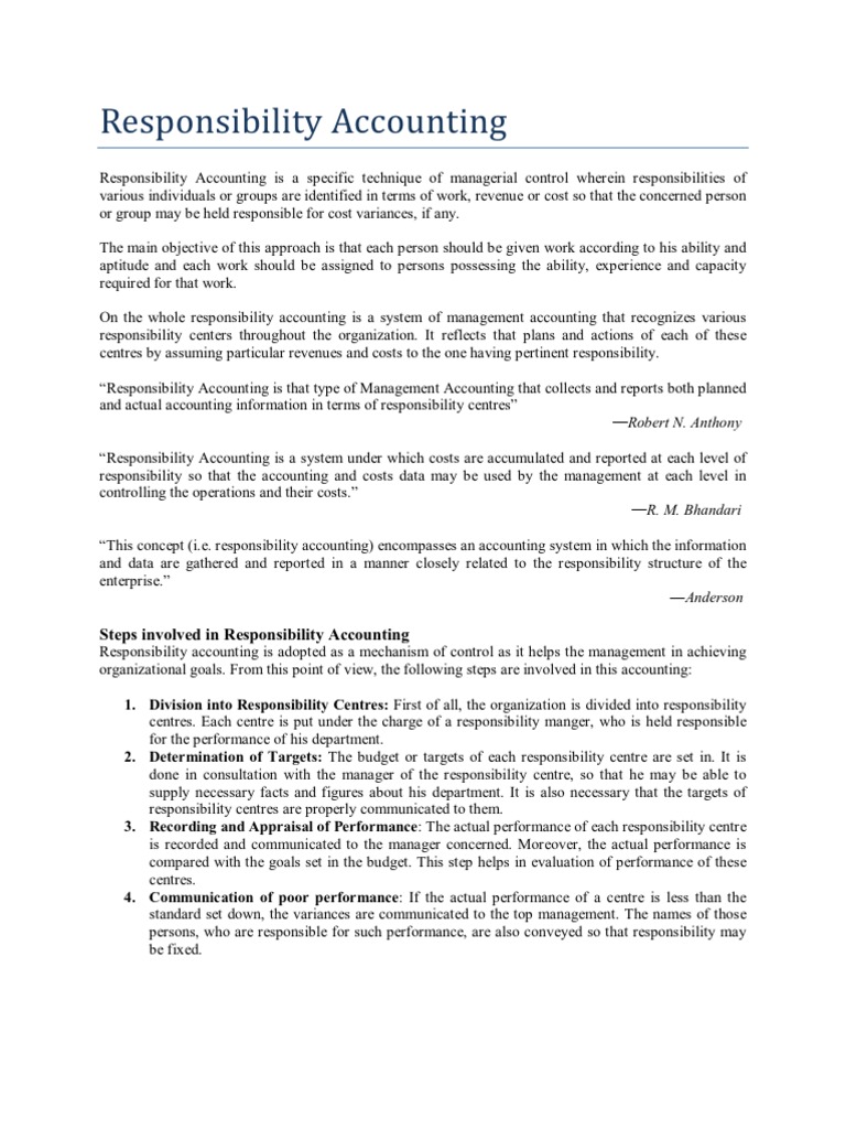 Define a responsibility centre in a responsibility accounting system. Each supervisory area is charged only with the cost for which it is responsible and over which it has control. Organized and clear lines of authority and responsibility are only incidental. It is a system that measures the plans by budgets and actions by actual results of each responsibility centre. A companys accounting system should support preparation of an accounting report for each responsibility center. In other words its a system that is used to gauge how well departments are managing expenses and controlling costs. Explain about the various types of responsibility centres930am 22417501 Management Ac.